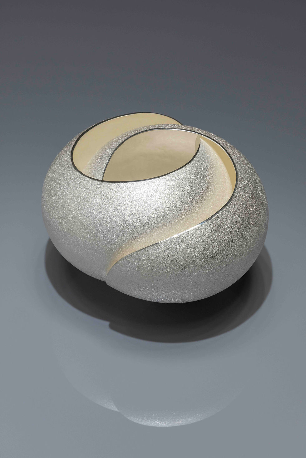 Sculpting with dramatic use of fluid and organic playful curves to create a sense of rhythmic movement. Skilfully manipulating the forms through the ancient art of hammering, while also introducing an abundance of rich surface textures, through the use of pattern and gold.